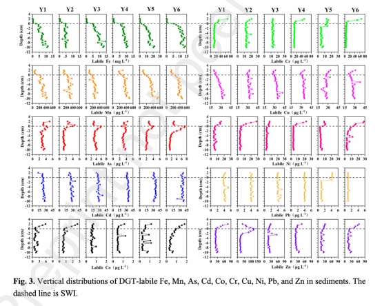 DGT活性態Fe/Mn在SWI處驟升,與沉積物氧化還原轉換相關;Zn/Cr/Ni在SWI下濃度穩定,反映同源地球化學行為;As在氧化層被Fe/Mn氧化物吸附,在還原層釋放。