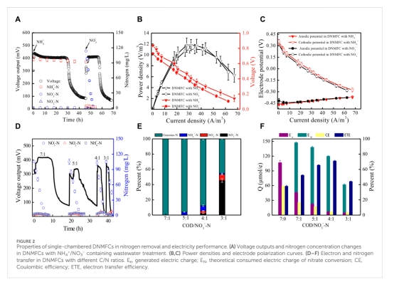 電化學性能數(shù)據(jù):電壓輸出、極化曲線、功率密度(圖2A-F)。意義:量化DNMFC的產(chǎn)電穩(wěn)定性(最大功率密度58.2 W/m3)及硝酸鹽對循環(huán)時間的縮短效應(yīng)(含NO??時循環(huán)時間縮短50%)。來源圖2。
