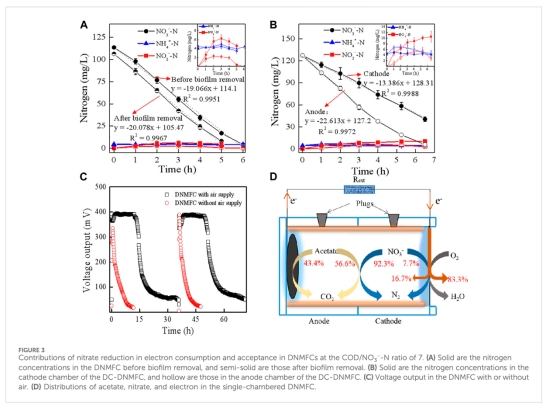 脫氮路徑創(chuàng)新:DNMFC以異養(yǎng)反硝化為主(92.3% NO??去除),電化學還原為輔(7.7%);氧氣是主要電子受體(消耗83.3%電子),硝酸鹽僅消耗16.7%。