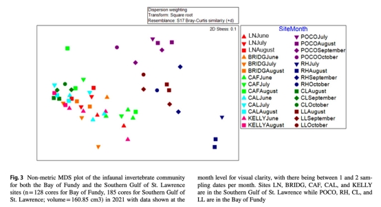 群落組成(圖3):芬迪灣CL站點群落與圣勞倫斯灣站點相似(PERMANOVA p<0.001)。意義:沉積物類型(CL為砂質(zhì))可能超越地理距離主導(dǎo)群落結(jié)構(gòu)。