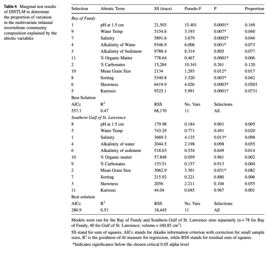 論文研究了加拿大新不倫瑞克省兩個潮間帶區(qū)域(芬迪灣和圣勞倫斯灣南部)水體與沉積物非生物因子(鹽度、沉積物粒度、碳酸鹽化學(xué)等)對底棲無脊椎動物群落及雙殼類幼體豐度的影響。研究發(fā)現(xiàn)碳酸鹽化學(xué)參數(shù)(尤其沉積物pH和堿度)解釋了群落變異的7-44%,其中芬迪灣沉積物pH解釋力最強(16.9%),圣勞倫斯灣鹽度解釋力最突出(9.8%)。堿度(水體或沉積物)在所有模型中均顯著,表明其對底棲生物的關(guān)鍵作用。