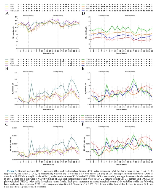 數(shù)據(jù):丙烯酸(ACR-1/2)降低CO?產(chǎn)量(實驗1:-11%,實驗2:-24%),富馬酸(FUM-2)降低H?排放率(投喂后1小時,-38%)。
