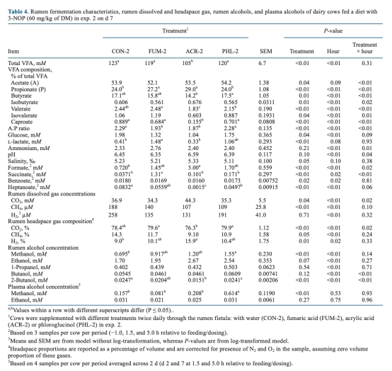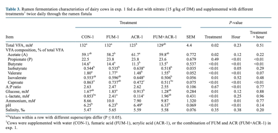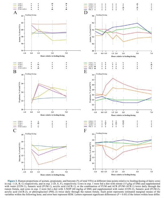 富馬酸和丙烯酸在3-NOP處理中顯著增加瘤胃丙酸比例(最高+5.2%),但對H?排放無持續(xù)影響。