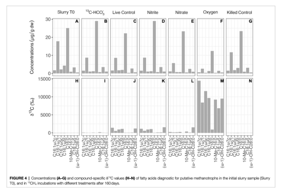 來源:圖4(脂質生物標志物δ13C值)、圖5(16S rRNA測序顯示的菌群組成)