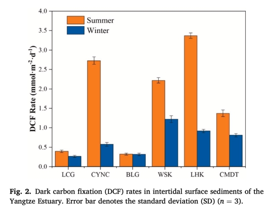 研究意義:直接量化潮間帶DCF速率,揭示其時(shí)空變異(夏季高于冬季),并推算長(zhǎng)江口年固碳量約4.5×10? t C。