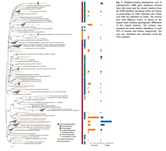 微生物群落(圖6–7):cbbM攜帶細(xì)菌以Gammaproteobacteria(如Sulfuricella denitrificans、Sulfuriferula)為主;古菌以Nitrososphaeria為主。
