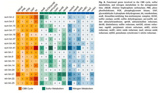 宏基因組分析(圖8):RubisCO基因(cbbLM)主要關(guān)聯(lián)Burkholderiales和Chromatiales;硫代謝(soxB、sat)、氮代謝(narGHI、nrfAH)基因共存于多數(shù)基因組bin中。