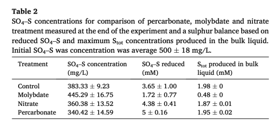 研究意義:量化H2S生產時空動態,顯示鉬酸鹽處理顯著降低水柱和沉積物H2S濃度(如M-50處理在沉積物-水界面減少73%),而硝酸鹽和過碳酸鈉僅臨時減少水柱H2S;這些數據直接驗證鉬酸鹽的抑制機制優于其他處理。