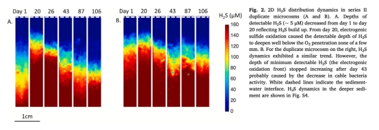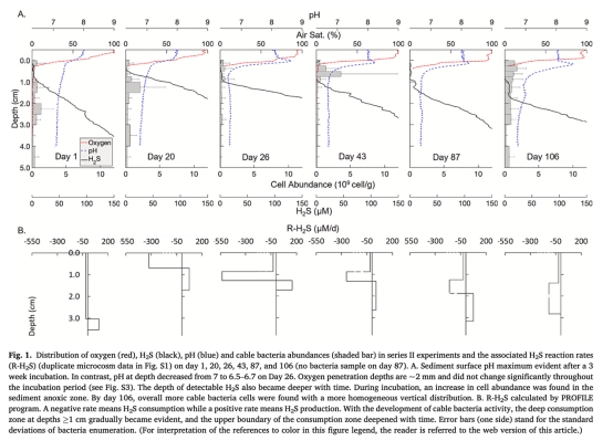 測(cè)量數(shù)據(jù):電纜細(xì)菌豐度垂直分布(AO染色/FISH技術(shù))(來自圖1,3)。研究意義:量化菌絲密度(最高2840 m/cm2)及時(shí)空動(dòng)態(tài)(初期富集亞表層0.25-1.5cm,后期向表底層擴(kuò)散),關(guān)聯(lián)代謝活性變化。