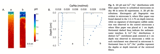 電纜細(xì)菌可在Fe/Mn貧乏碳酸鹽沉積物中建立活性,直接利用溶解態(tài)H?S(無需固態(tài)硫化物或Fe3?介導(dǎo)的硫歧化),形成陰極區(qū)(0-2mm)pH峰值(~8.5)和陽極區(qū)(≥1cm)H?S消耗,無典型亞氧化區(qū)。