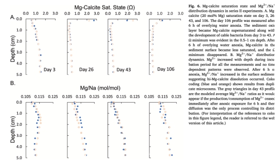探討了電纜細(xì)菌在缺乏鐵(Fe)和錳(Mn)的碳酸鹽沉積物(美國(guó)佛羅里達(dá)灣)中的活動(dòng)及其對(duì)元素循環(huán)的影響。通過實(shí)驗(yàn)室微宇宙實(shí)驗(yàn),結(jié)合高分辨率傳感技術(shù)(如平面光學(xué)傳感器和微電極),研究發(fā)現(xiàn)電纜細(xì)菌可利用深層溶解態(tài)硫化物(H?S)作為還原劑,無需依賴固態(tài)硫化物或鐵錳循環(huán)即可維持電硫氧化(e-SOx)代謝。電硫氧化導(dǎo)致沉積物表層(陰極區(qū))pH升高(~8.5)促進(jìn)文石和高鎂方解石沉淀(Ω=2-3),而亞表層(陽極區(qū))pH降低(~6.5)引發(fā)碳酸鹽溶解(Ω=0.2-0.3),伴隨Ca2?、Mg2?釋放。磷酸鹽(ΣPO?3?)在電活性區(qū)被消耗,可能與電纜細(xì)菌細(xì)胞內(nèi)聚磷酸鹽積累有關(guān),這對(duì)磷受限的碳酸鹽沉積物中海草磷獲取有潛在意義。