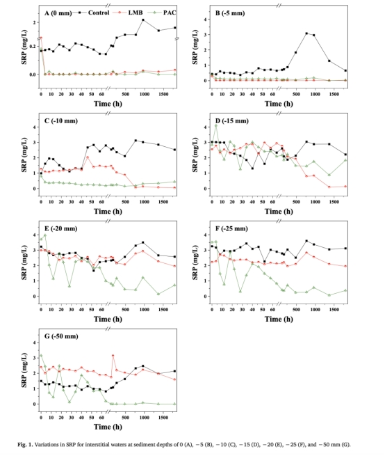 SRP(圖1):監測孔隙水中磷濃度變化,評估鈍化劑對磷的即時與長期去除效果。意義:揭示PAC對深層SRP(-50 mm)的高效控制(100%去除率),但中層(-15 mm)因pH降低導致去除率最低(35%)。
