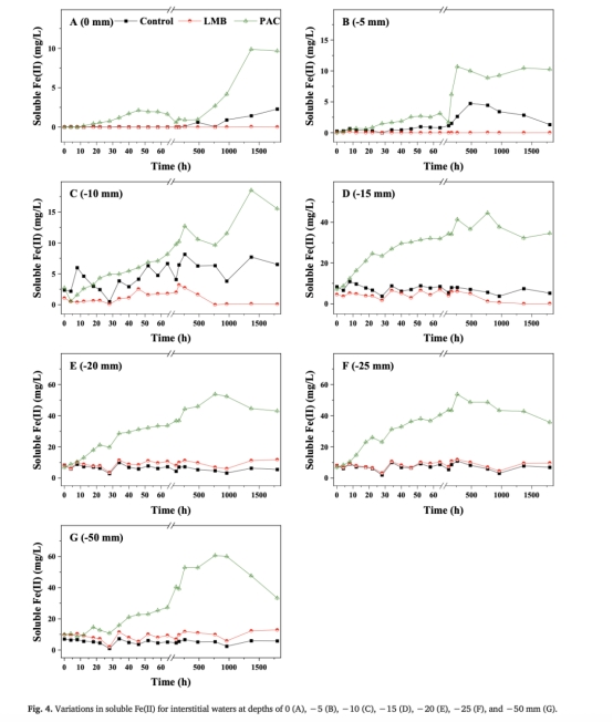 可溶性Fe(II)(圖4)與DGT活性Fe(圖5):同步監測溶解態和活性鐵。意義:揭示PAC引發全剖面Fe(II)劇增(pH降低促進解吸),直接驅動磷釋放(圖2中層通量升高)。
