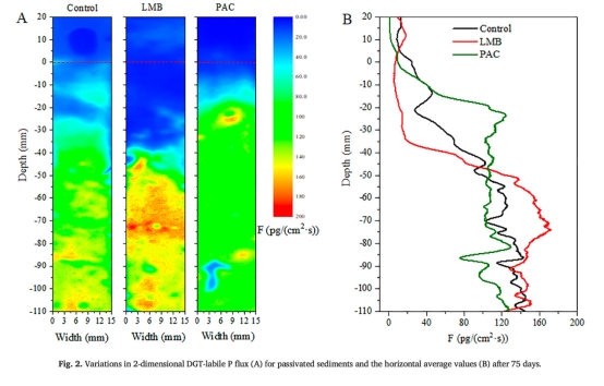DGT活性磷通量(圖2):二維空間分辨率(mm級)量化活性磷擴散通量。意義:直觀顯示PAC組中磷釋放熱點區域(-10~-50 mm),證實Al絮體吸附與Fe(III)還原溶解的競爭效應。