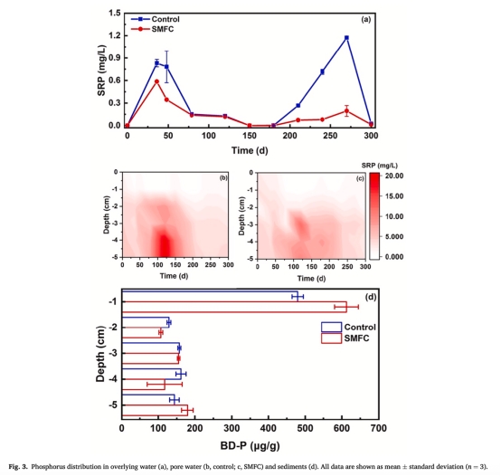 磷釋放抑制:SMFC使上覆水SRP峰值降低58%,表層沉積物BD-P增加28%,有效抑制磷釋放。
