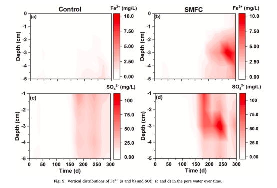 意義:SMFC組孔隙水SO?2?峰值達(dá)116 mg/L(第240天),F(xiàn)eS在陽(yáng)極附近減少,證實(shí)硫氧化促進(jìn)FeS溶解和Fe2?釋放。