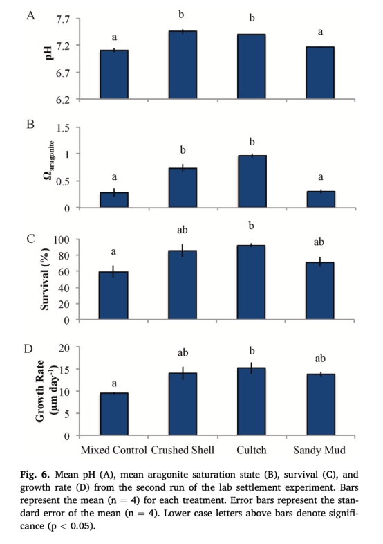 3. 幼蛤存活率/招募數量:實驗結束時計數活體數量或沉降數量。意義:評估緩沖對幼蛤渡過關鍵早期階段的影響。貝殼緩沖顯著提高了某些實驗中剛沉降或即將沉降幼蟲的存活(如:實驗室沉降實驗2,cultch存活92% vs 對照59%*;見Fig. 6C)。這表明緩沖對最脆弱的早期階段至關重要。