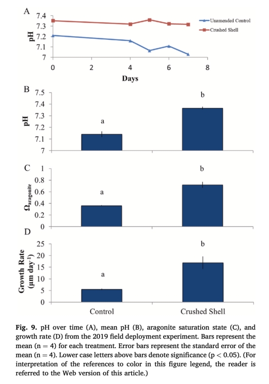 4. 幼蛤生長率(μm/day):測量初始和結束時的殼長計算日生長率。意義:反映緩沖對幼蛤能量狀況和發育速度的影響。快速生長有助于更快達到避免溶解和捕食的尺寸閾值。貝殼緩沖在幾乎所有相關實驗中均顯著提高了生長率(如:實驗室沉降實驗2,cultch生長15.2 μm/day vs 對照9.5 μm/day;2019野外實驗,碎殼生長16.9 μm/day vs 對照5.5 μm/day;見Fig. 6D, Fig. 9D)。這表明緩沖緩解了酸度脅迫,促進能量投入生長。