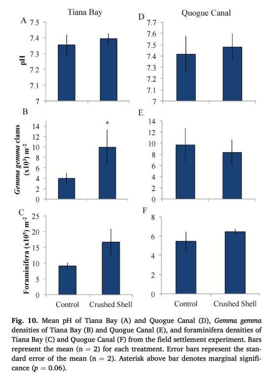 6. 鈣化底棲生物密度(野外實驗):計數核心樣品中的寶石蛤(Gemma gemma)和有孔蟲數量。意義:評估貝殼緩沖對底棲群落中其他鈣化生物的潛在益處,顯示方法的生態價值。在較泥濘的Tiana灣站點,貝殼處理顯示出寶石蛤密度增加趨勢(9960 vs 3960 ind. m?2, p=0.06)和有孔蟲密度增加(16.6 vs 9.14 x 10? ind. m?2)(見Fig. 10B, C)。這表明緩沖效應可能惠及更廣泛的鈣化生物群。