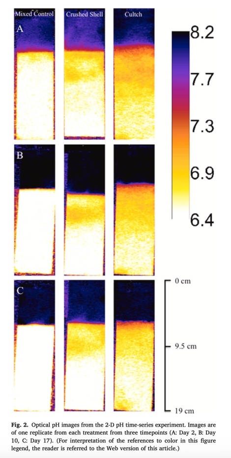 向有機質豐富的泥質沉積物中添加貝殼碎屑(碎殼或殼粉)能有效提高孔隙水pH和文石飽和度(Ωaragonite),緩解沉積物酸化。