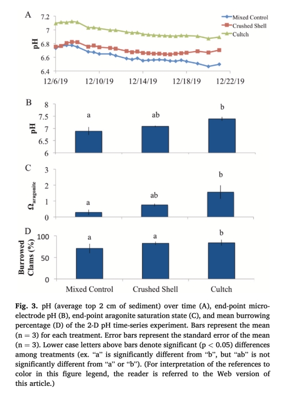 摘要指出,富含有機質的泥質沉積物中的酸性條件會損害幼年貝類的生長和存活。向沉積物中添加碳酸鹽貝殼碎屑是一種潛在的緩解策略。通過實驗室和野外實驗,評估了貝殼添加物(碎殼~0.5 cm和牡蠣殼粉cultch~250μm)對沉積物化學性質(孔隙水pH和文石飽和度Ωaragonite)以及幼年硬蛤(從幼蟲到幼貝階段)的沉降、生長、存活、潛沙行為的影響。結果表明,貝殼添加顯著提高了孔隙水pH和Ωaragonite,使剛結束幼蟲期的幼蛤生長和存活顯著增加,且沉降階段的幼蛤比剛沉降的幼蛤受益更大。幼蛤(2-5 mm)在緩沖沉積物中的潛沙行為顯著增強。野外實驗也證實了貝殼緩沖能促進幼蛤生長。此外,本地鈣化底棲生物(寶石蛤Gemma gemma和有孔蟲)更傾向于在緩沖沉積物中沉降。結論是向泥質沉積物添加貝殼是一種簡單有效的策略,可改善碳酸鹽化學環境,促進硬蛤和其他鈣化底棲生物的早期生活史表現。