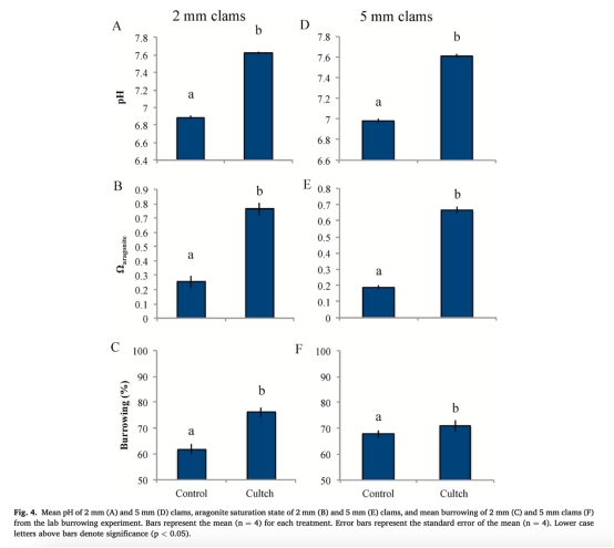 2. 文石飽和度狀態(Ωaragonite):通過測量的pH和堿度(或DIC),結合溫度、鹽度,使用CO2Calc軟件計算。意義:Ωaragonite<1表示文石溶解傾向,對幼蛤殼形成威脅。貝殼添加顯著提高了Ωaragonite(如:2-D實驗末,cultch處理Ω=1.56 vs 對照0.30, Δ+1.26;潛沙實驗5mm蛤,cultch Ω=0.66 vs 對照0.19, Δ+0.47;見Fig. 3C, Fig. 4B,E)。這表明緩沖顯著降低了幼蛤面臨的溶解壓力。