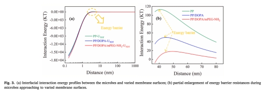 微生物附著能壘:PP(113.2kT)→PP/DOPA(49.8kT)→PP/DOPA/mPEG-NH?(18.1kT)(圖3b)