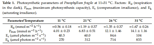 表1: 光合參數的溫度響應(Rd:暗呼吸;Pmax:最大光合能力;Ec:補償光照;Ek:飽和光照)