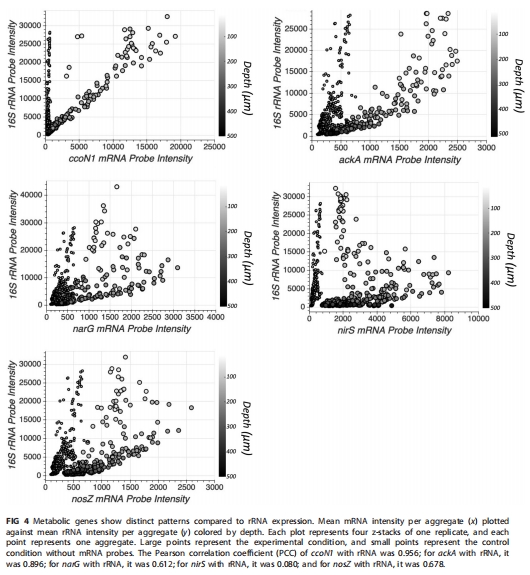 0-50μm(有氧區(qū)):ccoN1表達(dá)最強(qiáng)(PCC=0.956 vs 16S rRNA),ackA在聚集體核心激活;