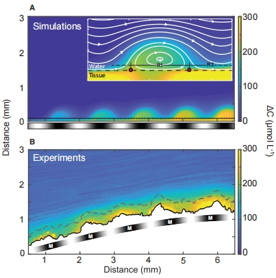 氧氣分布悖論:DBL中高氧區(qū)位于低葉綠素的口部上方,低氧區(qū)位于高葉綠素的共肉上方(圖2C-D)