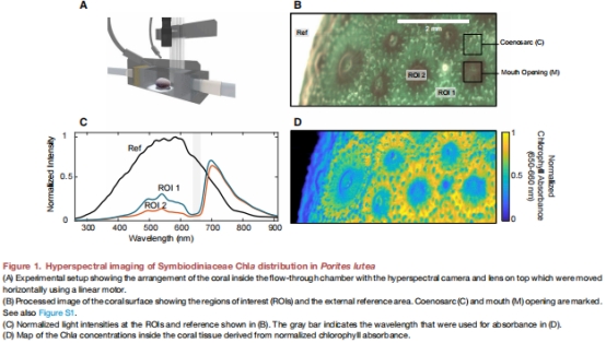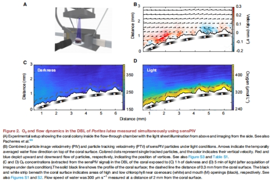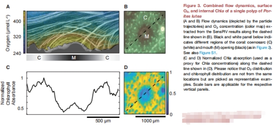 研究通過高光譜成像(圖1)和氧敏感粒子示蹤技術(shù)(sensPIV)(圖2)首次揭示珊瑚(Porites lutea)表面纖毛渦流對光合產(chǎn)氧的主動調(diào)控機(jī)制: