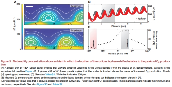 纖毛渦流作用:形成尺度500μm的渦旋(圖2B),將共肉產(chǎn)生的氧氣橫向輸送至口部區(qū)域(圖3)