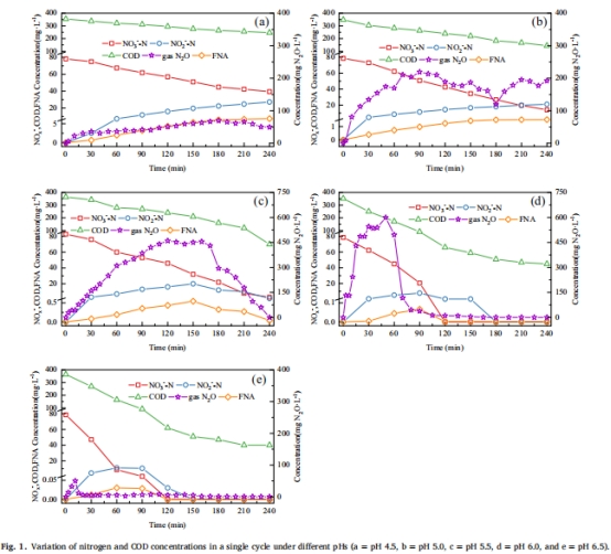 圖1:不同pH下氮/COD濃度變化 → N?O產率與亞硝酸鹽積累關系