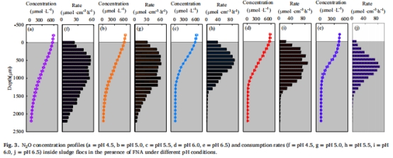 有FNA時N?O生成速率 圖5f–j FNA存在進一步刺激生成速率(pH4.5時比無FNA高8.4%),增加底物效應。