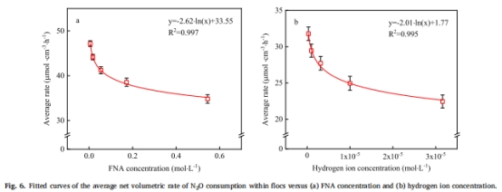FNA存在時,N?O消耗速率進一步降低(pH4.5: 34.82 vs. 22.45 μmol·cm?3·h?1),但通過圖6擬合曲線明確FNA僅協同放大H?的抑制效果。