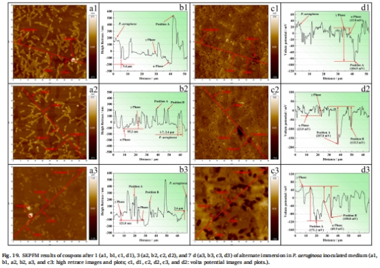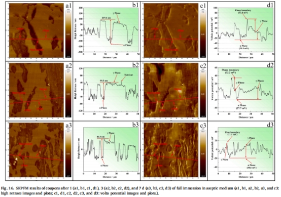 微生物行為:生物膜CLSM成像(圖3)、活菌計數(圖4)、SKPFM電位分析(圖15-19)。