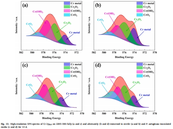 鈍化膜組分與缺陷 圖12(Mott-Schottky),圖13(XPS) 含菌交替浸沒CrO?含量最高(17.3%),缺陷密度ND最大(6.12×102? cm?3),加速溶解。