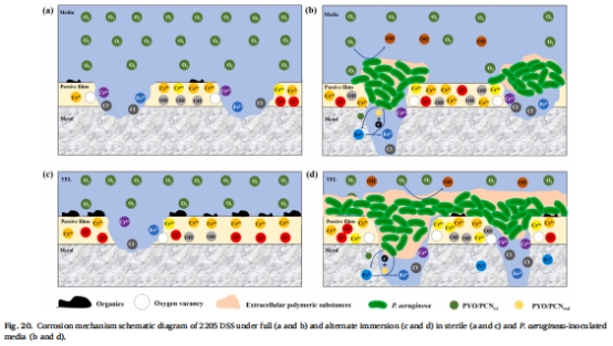 論文探究了銅綠假單胞菌(Pseudomonas aeruginosa)在完全浸沒(full immersion)與交替浸沒(alternate immersion)條件下對2205雙相不銹鋼(DSS)點蝕行為的差異影響。關鍵發現包括: