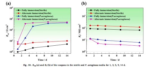 浸沒模式差異:在無菌介質中,交替浸沒可抑制點蝕;但在含菌介質中,交替浸沒會進一步加速腐蝕(最大點蝕深度達7.8 μm,比完全浸沒高73%)。