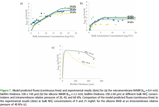 模型驗證:MABR模型成功預測兩種膜的硝化通量趨勢(圖7)。