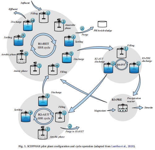 中試系統(tǒng):在西班牙Manresa污水處理廠搭建SCEPPHAR中試系統(tǒng)(圖1),包含四個(gè)反應(yīng)器: