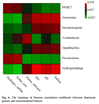 微生物群落重構(gòu):硝酸鹽降低沉積物中硫酸鹽還原菌(SRB,如MSBL7屬)豐度,同時增加苦草葉片生物膜中硫氧化菌(SOB,如Aeromonas)和硝酸鹽還原型硫氧化菌(NR-SOB,如Hydrogenophaga)的豐度(圖5)。環(huán)境因子(DO、pH、硝酸鹽)與微生物群落變化顯著相關(guān)(圖6)。
