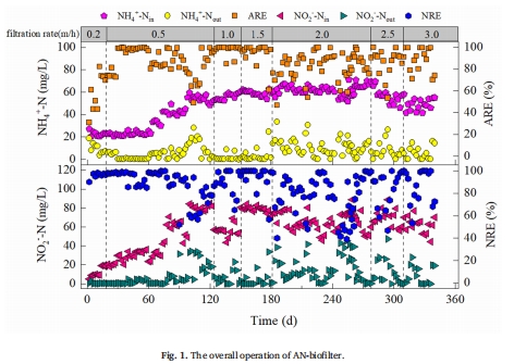 最優操作條件:濾速1.5 m/h時脫氮效率最高(NH??-N和NO??-N去除率>99%),且N?O產量最低(圖1, 圖2f)。