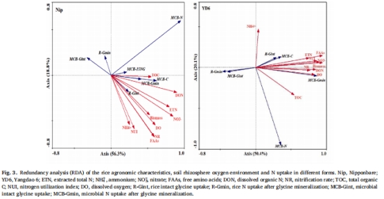 水稻直接吸收1?N-甘氨酸比例:Nip(4.9-10.3%),YD6(7.7-13.6%)。
