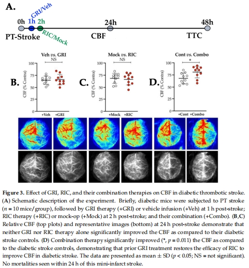 單獨使用RIC或GRI在糖尿病卒中模型中均無效(圖3-4),但 GRI預處理后聯合RIC 顯著提升腦血流(CBF)(圖3C)、減少梗死體積(圖4C)并改善神經功能(圖5)。