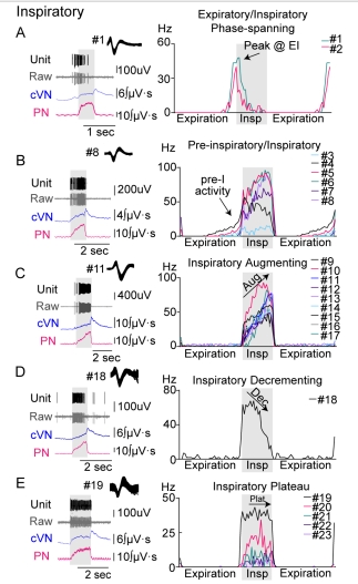 基線期:記錄正常三相呼吸(inspiration, post-inspiration, late-expiration)下的神經元活動。