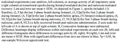 核心發現:芬太尼誘導的呼吸暫停(apnea)中,吸氣神經元(inspiratory neurons)活動顯著抑制(78%完全沉默),而呼氣神經元(expiratory neurons)雖放電頻率降低但仍維持緊張性放電(79%持續活動)。