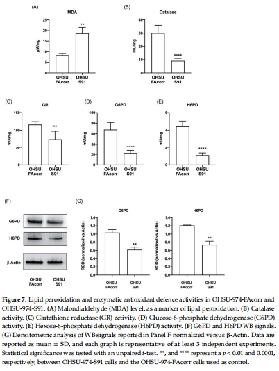 氧化應(yīng)激加劇:脂質(zhì)過氧化標(biāo)志物MDA升高2.5倍(圖7A),抗氧化酶(G6PD、H6PD)活性下降40-60%(圖7B-E)。