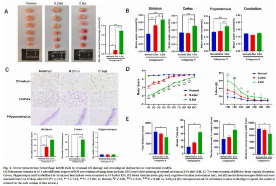模型:膠原酶誘導小鼠嚴重ICH(0.5μL,紋狀體/皮層/海馬多區(qū)域損傷,圖4A)。