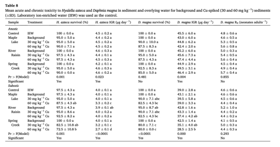 4. 生物驗(yàn)證:H. azteca(沉積物)和D. magna(上覆水)毒性測(cè)試評(píng)估Cu生物有效性(表8)。